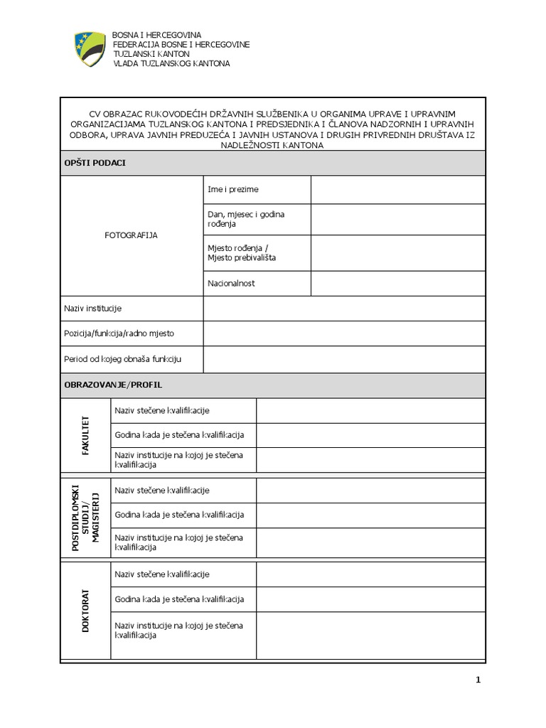 Cv Obrazac Za Rukovodece Sluzbenike Organa Upraveclanove No Uo Uprava Ju I Drugih Priv Drustava U Nadleznosti Kantona Pdf